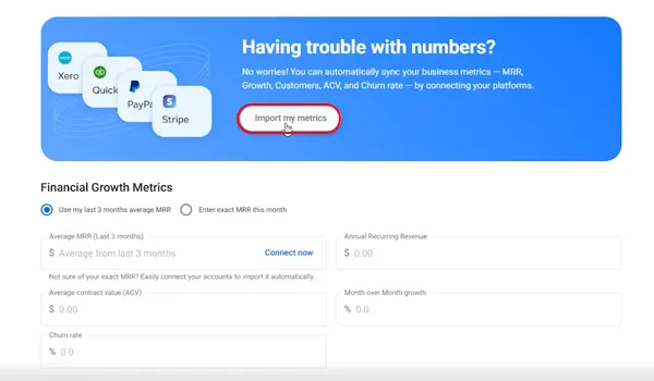 During onboarding, FE Capital allows you to import your financial metrics directly from your billing or accountingplatforms. This ensures your most important KPIs are automatically updated and investor ready.